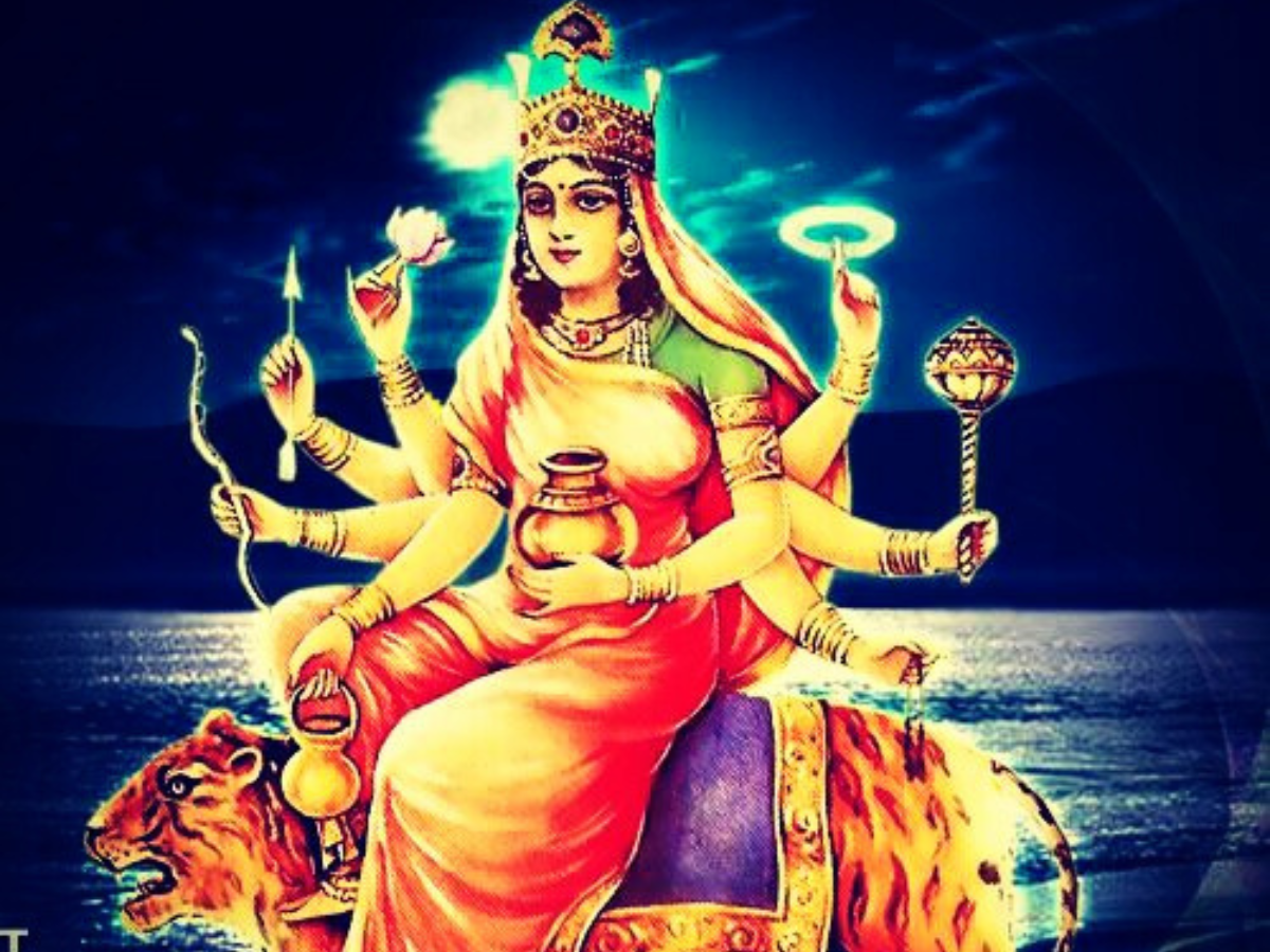 The word “Kushmanda” consists of three words – Ku (small), Ushma (energy or warmth), and Anda (cosmic egg). It collectively represents the one who formed the universe with her divine smile and energy. She is shown with eight arms, each holding weapons, rosary, and a nectar jar. Maa Kushmanda sits on a lion, which represents strength and courage. She is also addressed as “Ashtabhuja Devi.”
