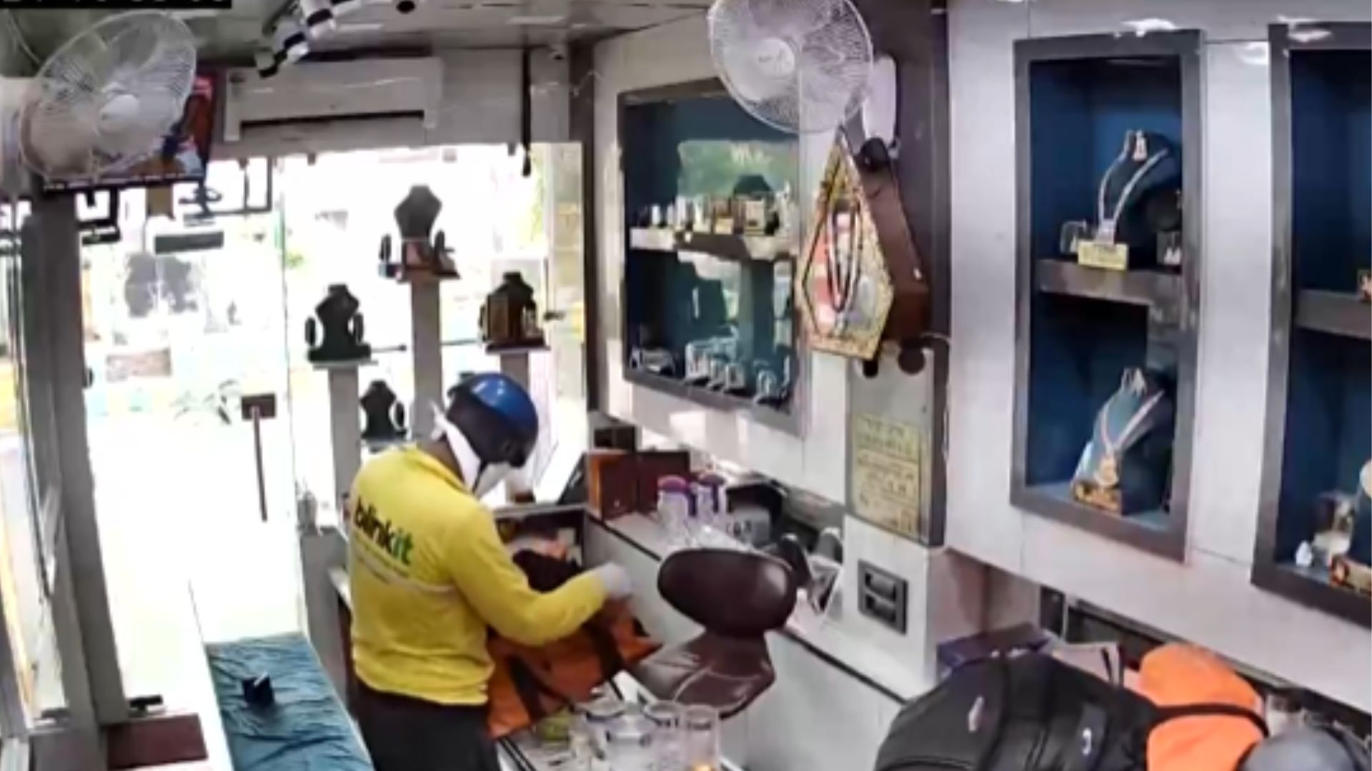 A shocking robbery at a jewellery store in Ghaziabad was caught on CCTV, showing two thieves disguised as food delivery partners stealing valuables worth thousands of rupees. One man wore a Blinkit uniform, while the other posed as a Swiggy delivery agent. The video, shared by ANI, shows the duo calmly filling bags with jewellery as the store’s lone employee stands nearby.