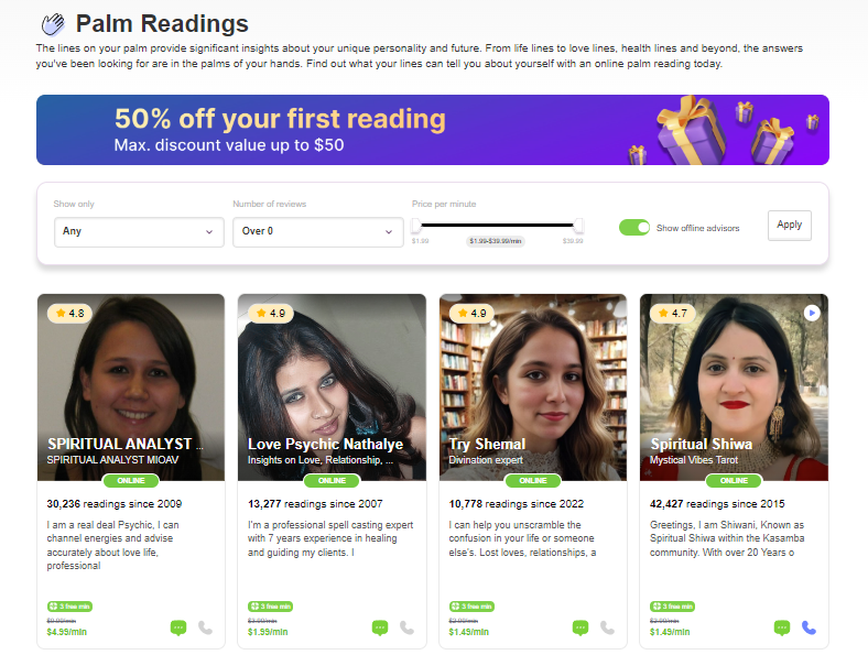Psychic Source has been providing spiritual readings for decades, making it one of the most established platforms in the industry. Their palmistry specialists are carefully vetted, and all sessions have a satisfaction guarantee. Promotional rates for new users make it a safe way to try a palm reading with minimal risk.